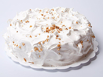 Massa de pão de ló e chocolate recheada com creme de ovos, crocante de caju, suspiros e nata.