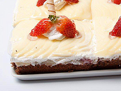 Massa de chocolate ou pão de ló com cobertura de creme de iogurte com morangos.