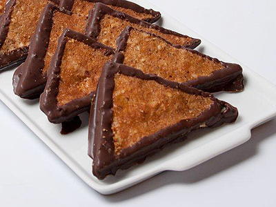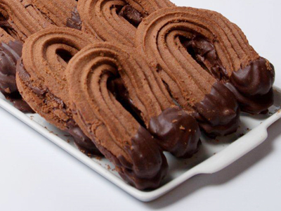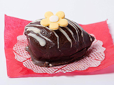 Massa especial de chocolate com castanha do pará, recheada com geléia de damasco e coberta com chocolate.
