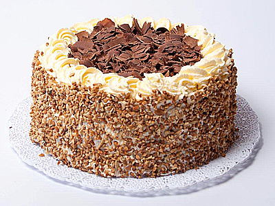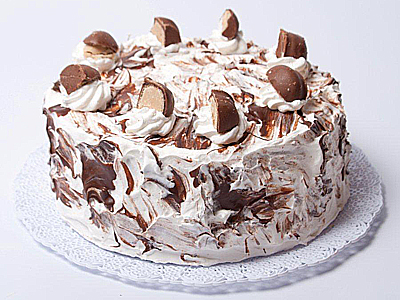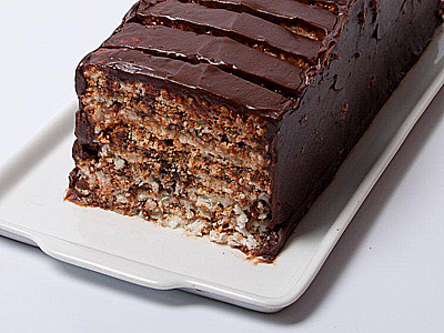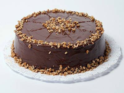 Massa de chocolate recheada com creme de nozes, coberta com chocolate.