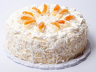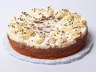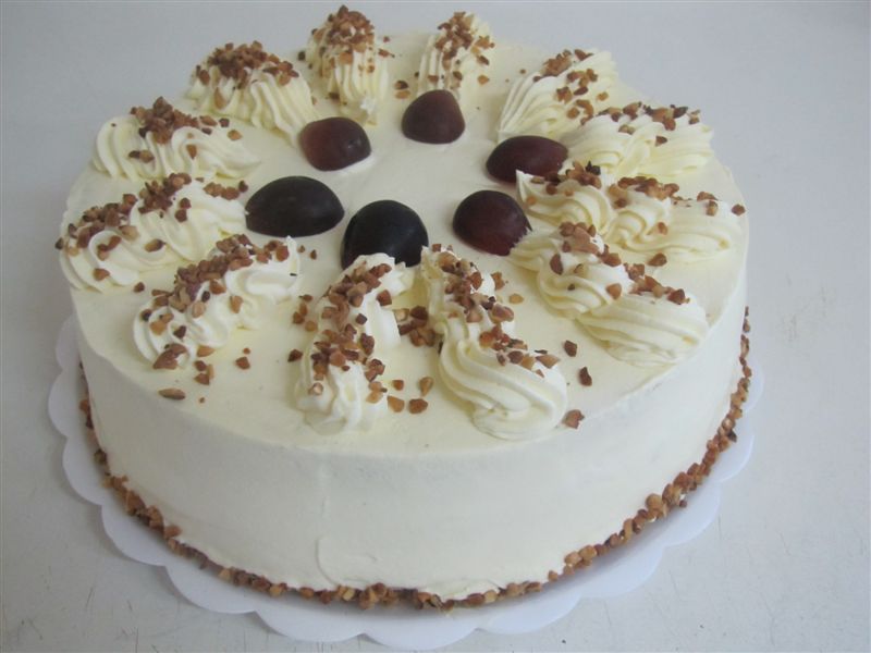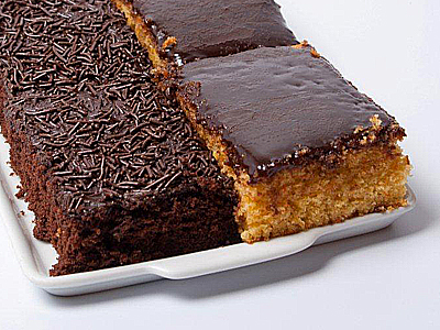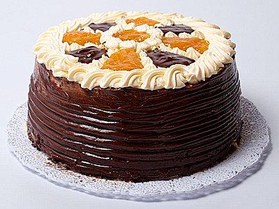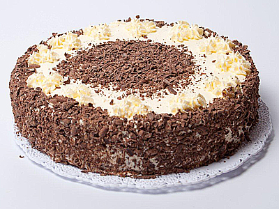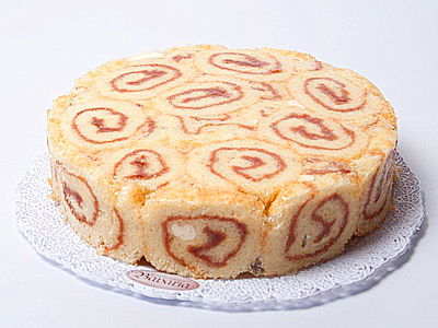 Massa pão de ló e chocolate. Recheada com frutas. Opções: ameixa, damasco, pêssego, abacaxi, coco ou nozes