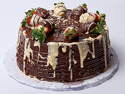 Massa chocolate com recheio de brigadeiro, brigadeiro branco, morangos e nata. Cobertura de ganache.