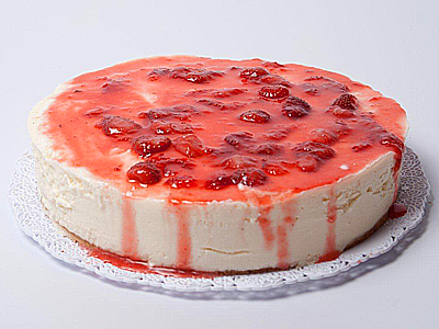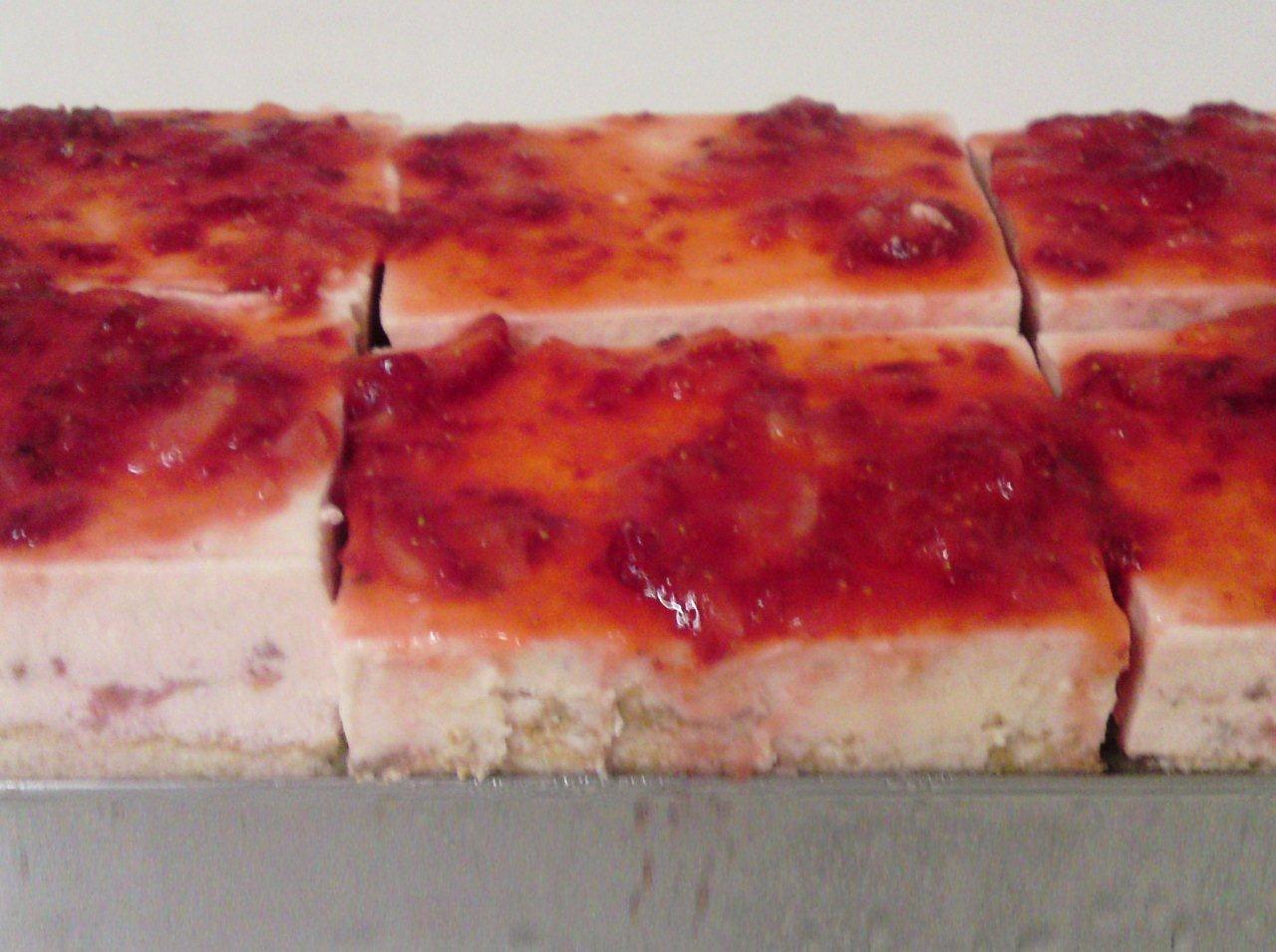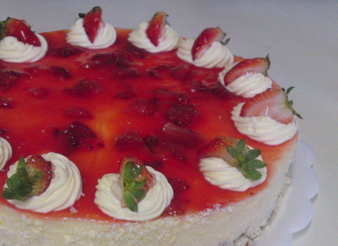 Massa flora com recheio de requeijão, leite condensado e ricota. Coberta com calda de morango.