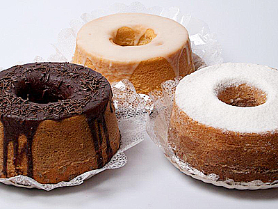Inglês (massa mesclada, cobertura açúcar). Laranja (Massa de laranja, cobertura açúcar com suco de laranja). Formigueiro (Massa com granulado cobertura creme de chocolate e granulado).