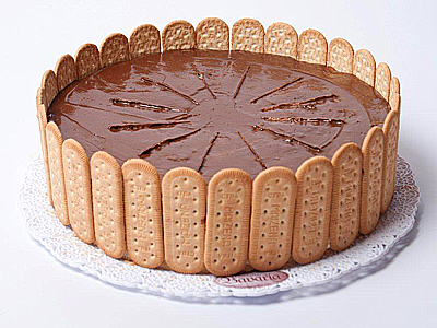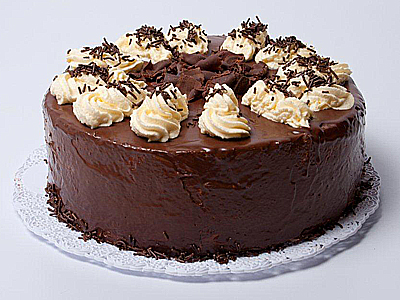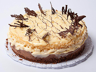 Biscoito intercalado com creme alemã. Coberto com creme de chocolate.