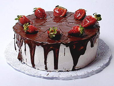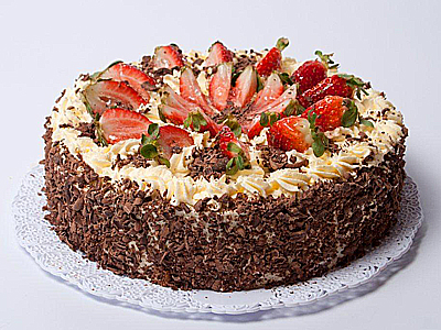 Massa de chocolate, recheada com morango e nata. Também disponível: Morango massa pão de ló e morango com suspiro. Todas com um ou dois recheios.