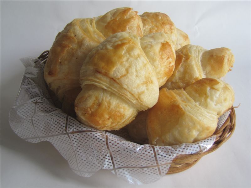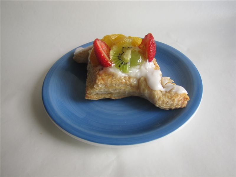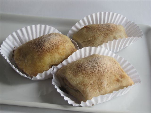 Massa folhada com banana, maça ou coco. Também com creme e frutas frescas.