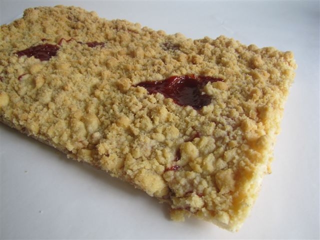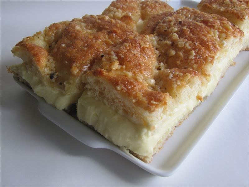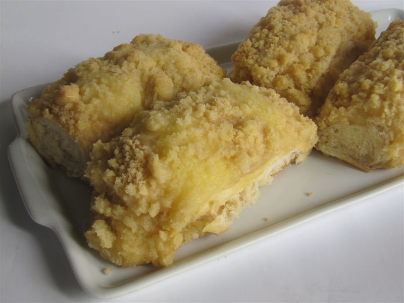 Massa de pão doce, coberta com farofa ou creme de baunilha e farofa.