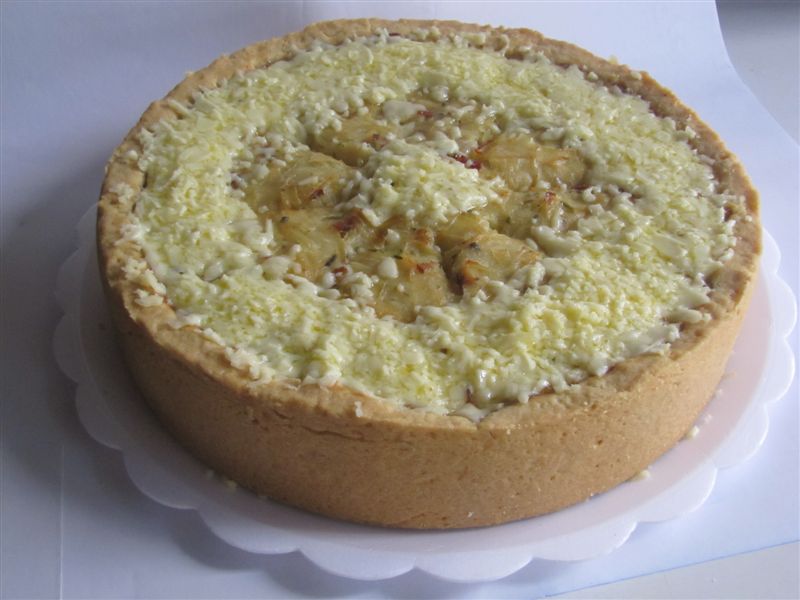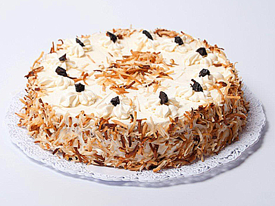 Massa de coco queimado recheada com nata, passas ao rum e creme de ovos.