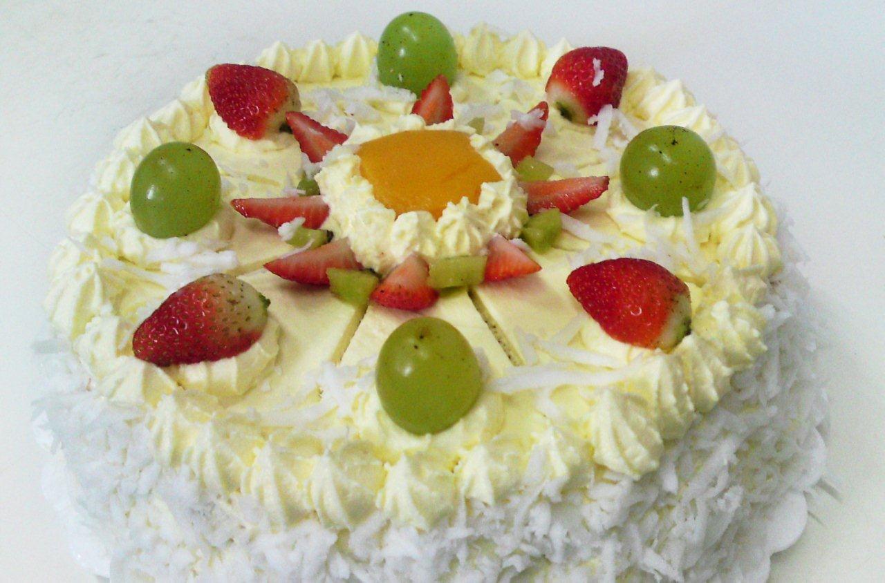 Pão de ló coberto com creme de baunilha e frutas frescas.