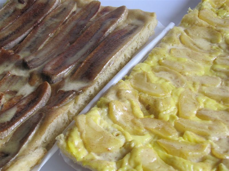 massa de pão doce com coberturas: banana c/ nata, banana c/ farofa, coco c/ creme, maçã c/ creme