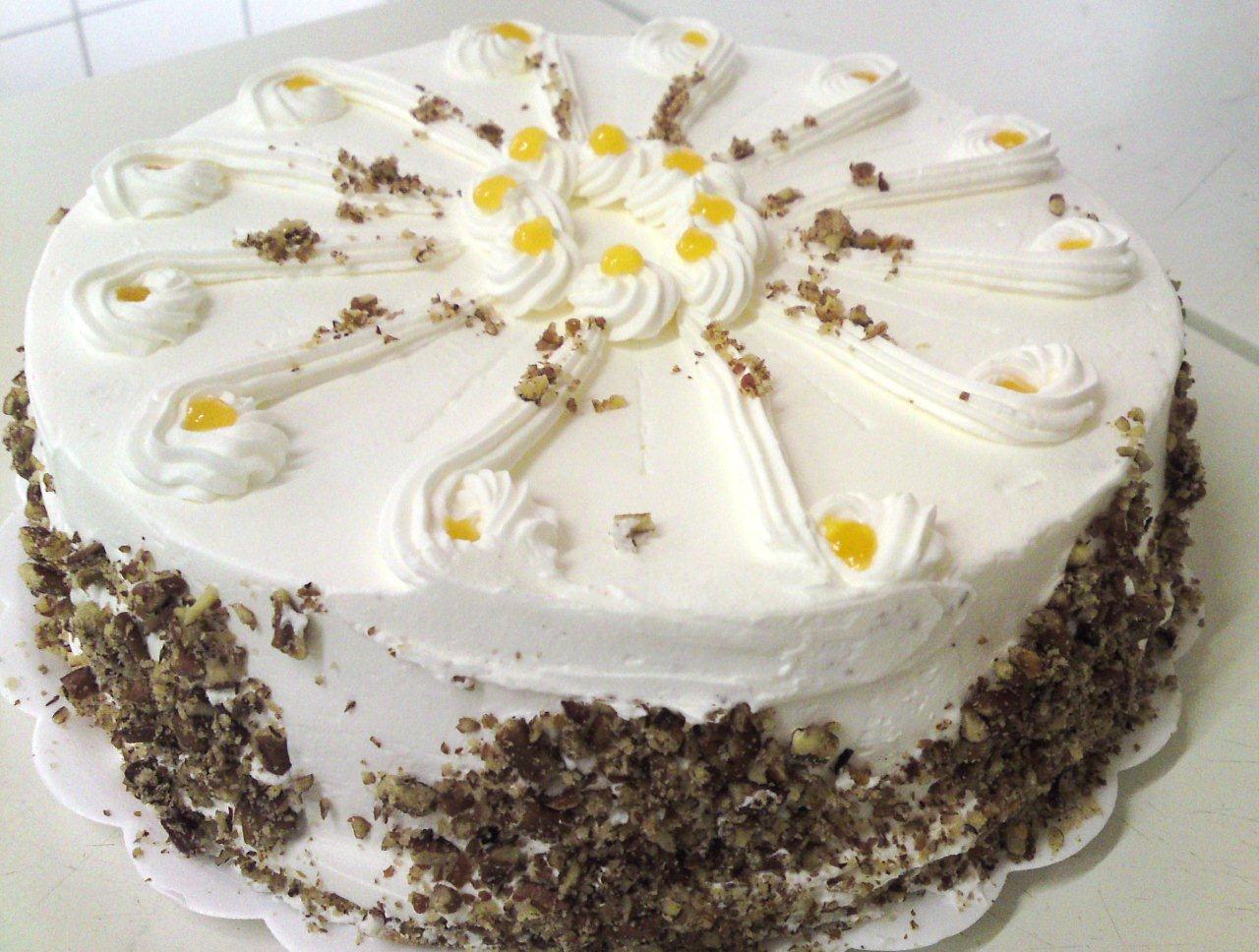 Massa de cuca coberta com castanha do pará e recheado com creme de baunilha e nata.