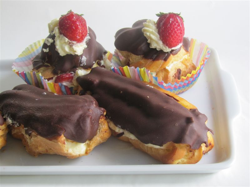 Massa de bomba, coberta com chocolate e recheado com creme de baunilha e nata (sonho de valsa e morango)