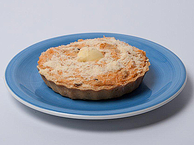 Massa amanteigada de bolo, coberta com frutas e farofa.