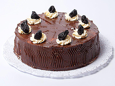 Massa de chocolate recheada com damasco e ameixa, coberta com chocolate.