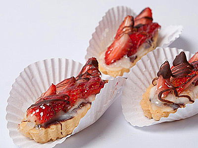 Massa flora com creme de baunilha e morangos. Também disponível com frutas sortidas.