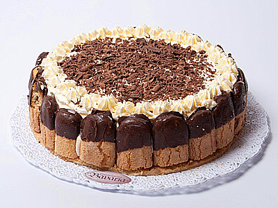 Massa pão de ló umedecida com café, chocolate e amaretto, recheio com creme de leite, biscoito champagne na lateral.